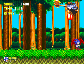 sonic y tails siguieron y encontraron 3 anillos multicolor y cuando llegaron al final de la fase se encontraron con un torpe con forma de huevo (el Dr.robotnik claramente)